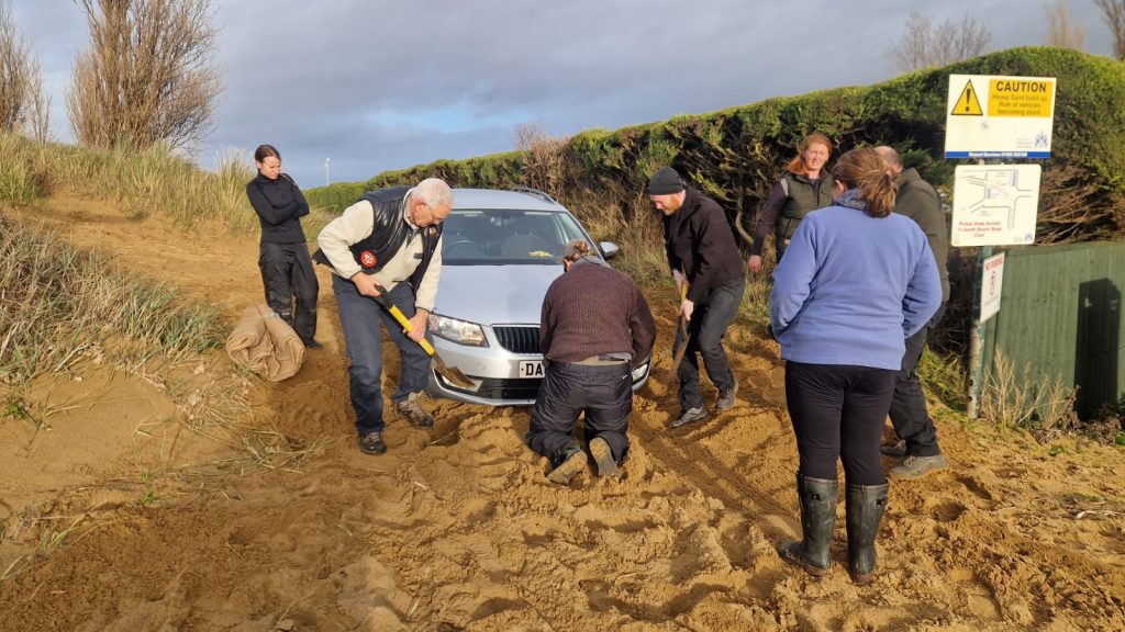 Once we had arrived, a film crew arrived to get some footage for a proposed follow-on documentary looking at the international reach of WWRG. They wanted to interview Mark and get some footage of the cannon nets being set. As always happens when time is of the essence, as the tide was making its way in fate decided to put some obstacles in our way. Firstly, the car (with unfamiliar to Norfolk navigators) towing the trailer (with all the equipment needed to set up the cannon nets) got stuck in the sand, needing a team of diggers to get it out (note the caution sign in the photo)! Once the car had been freed, the trailer was unhooked and unpacked. Unfortunately, this was quite a distance from where the nets were going to be set, which meant quite a few long back-and-forth trips between the trailer and the beach with equipment, taking up time which we were already short of. Finally, the battery in Nigel’s car had died at the gate entrance to Heacham South, which meant another trip to go and grab the required equipment from there before we could finish setting up! Yet, despite these problems, we got the nets set up and everyone got into position as the sun was starting to set.