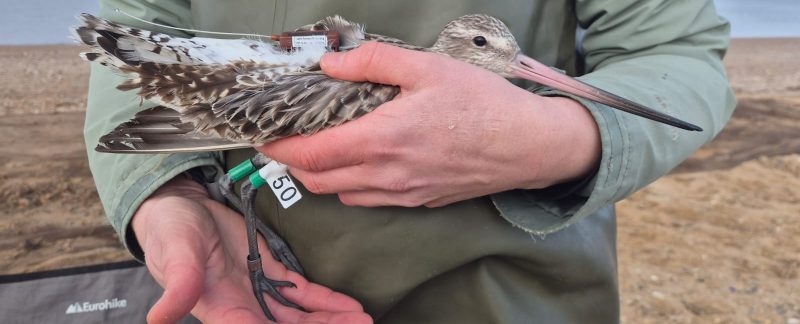 Katharine had joined the catch earlier in the morning with the aim of tagging Bar-tailed Godwit with GPS tags in order to monitor both their winter and migratory movements. Katharine has the appropriate BTO Special Methods permissions to attach GPS tags to Bar-tailed Godwit using a harness. Therefore, Katharine, with help from Mark, ringed and processed the four Bar-tailed Godwit that were caught and tagged the largest one.