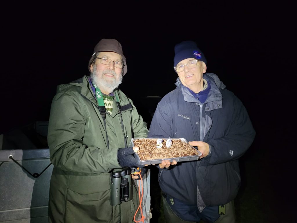 Once the lower, single net had been retrieved and the trailer was packed, we had a celebratory slice of cake to commemorate 50 years since Nigel and Tim started with the WWRG. The actual 50th anniversary was back in September 2025, but there hadn’t been enough time on intervening WWRG weekends to celebrate. Nigel and Tim have played an integral role in WWRG over those 50 years, and their outstanding contributions are too numerous to mention. A big thank you from everyone who’s volunteered with WWRG for all their help over the years!