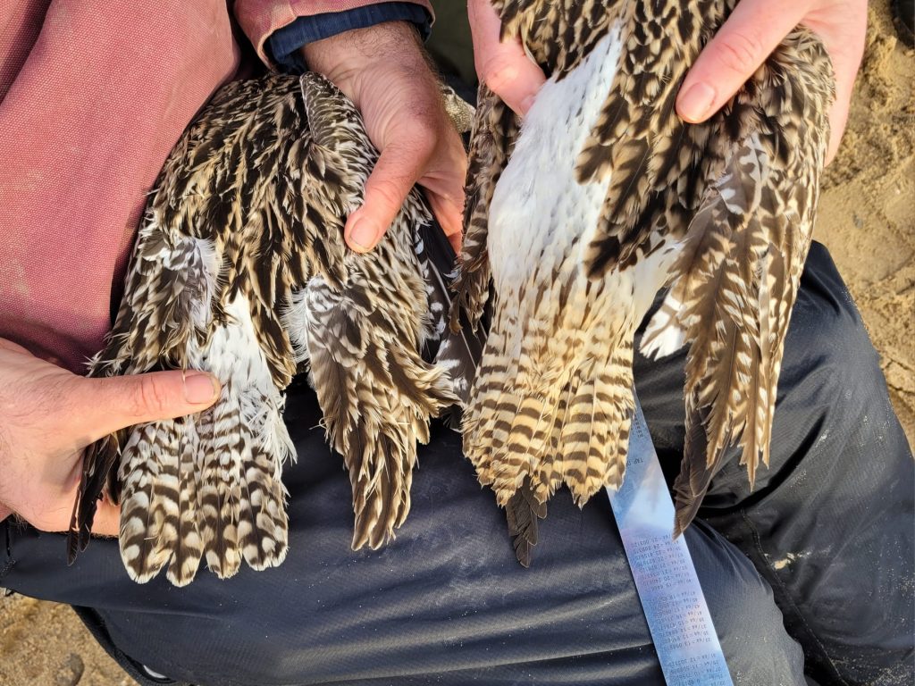 Examples of adult (left, age code 4) and juvenile curlew (right, age code 3). The white fringes of the tertial feathers are more worn in juveniles compared to adults, creating a serrated edge appearance to the feathers.